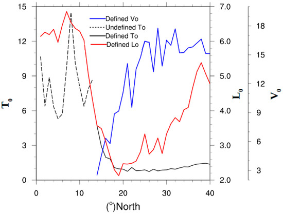 Variation of the characteristic length (L0 in red, in degree), of the characteristic duration (T0 in black at the right, in days) and of the characteristic speed (V0 = L0/T0 in blue, in km·h−1) as a function of the latitude from 0 to 40° N. The black solid line indicates the latitudes where exponential law is defined for duration and dashed line latitudes where it is not defined.