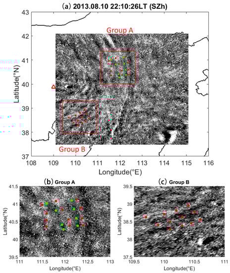 The five rings of the group A (22:07 LT–22:12 LT) and the three rings of the group B (22:09 LT–22:13 LT) were chosen to estimate the center of the CGWs. The wave crests (bright parts) and wave troughs (dark parts) are marked with red and green dots, respectively, in Figure 1. The least square method [29,62] was employed to obtain a more accurate fitting result from the eight fringes. The best fitting center of circles and radii minimized the total residual sum of the squares, S [28,29,30].
