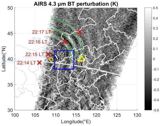 The air temperature perturbation is an important indication of GWs in the stratosphere and mesosphere. Dewan et al. [14] reported the first satellite observations of thunderstorm-generated GWs using data from the Midcourse Space Experiment. Since 2002, the Atmospheric Infrared Sounder (AIRS) onboard NASA’s Aqua satellite has been detecting thermal radiation in the atmosphere [15,16,17,18]. The radiance measurements are the most sensitive to temperature perturbations in the fundamental band peak at a height of ~41 km. Thus, AIRS radiance measurements at 4.3 μm are used to detect stratospheric GWs [15,17,18,19,20].