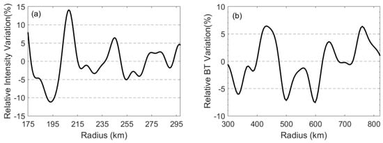 Although the background emission will bring disturbance into the OH images [27,52], the relative variation is still a credible parameter to evaluate the perturbation caused by GWs [43]. The luminous intensity variation indicates the amplitude of GWs. The relative luminosity intensity, extracted from raw unwrapped OH images, is defined as ΔI/I, and the relative radiation temperature was defined as ΔT/T. In Figure 3, the average perturbation amplitude of ΔI/I is 6.14%, while the average perturbation amplitude of ΔT/T is 5.01%. The disparate methods and observation principles can cause the systematic deviation between the amplitudes of ΔI/I and ΔT/T, and wave amplitude damping caused by observational filters must be considered [15]. Smaller amplitudes in the stratosphere could be explained by gradual energy dissipation with the increase in horizontal propagation distance.