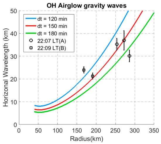 The dispersion relation is widely used to estimate the position and time of a GW’s excitation source by verifying actual wave parameters in accordance with the theoretical dispersion relationship. Yue et al. [30] and Fovell et al. [65] used 12 km as the height of the tropopause, while at the Shuozhou station km, as per the NCEP (National Centers for Environmental Prediction) reanalysis data. Therefore, km is the vertical distance from the tropopause to OH airglow layer (~87 km) in Equation (1). In Figure 4, group A propagated a greater distance than group B, and so the horizontal wavelength of group A is obviously longer than group B. The uncertainties in the horizontal wavelengths are due to the difference between each waveform and the average value, which is caused by wave interference and noise when identifying the bright or dark bands in the airglow image. Comparing the observed horizontal wavelengths with their theoretical propagation curves, it could be seen that, in the OH airglow layer, the wavelengths and propagation distance approximately satisfied the 150 min curve (red line) in Figure 4. According to the observation, the excitation times of group A and group B were 19:37 LT and 19:39 LT on 10th August, respectively.