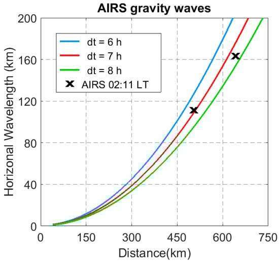 Due to the atmospheric dispersion relation, the GW with longer horizontal wavelengths can propagate longer distances under the assumption of zero wind. The Boussinesq GWs dispersion relation is [30,59]