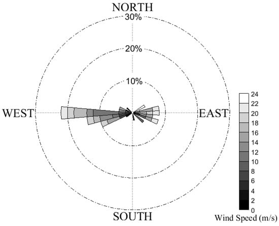 Both propagation and breaking are the main phenomena of GWs and they are dictated by the horizontal prevailing wind in the stratosphere [67]. Therefore, the zonal wind is the principal factor controlling the GW’s propagation processes. The wind direction opposite to the direction of the GW’s horizontal propagation facilitates upward propagation in the upper atmosphere. Using the ECMWF (European Centre For Medium-Range Weather Forecasts) reanalysis data, the horizontal background wind field was statistically analyzed between the tropopause (~13 km) and the mid-stratosphere (~30 km) above the excitation thunderstorm at 18:00 LT. It is usually observed that eastward winds reverse direction to become westward winds at the bottom of the stratosphere. As shown in the wind-rose diagram (Figure 6), this region was mainly controlled by the background westward wind, and the maximum wind velocity was less than −22 m/s (westward winds). According to the classical wave theory, stratospheric westward wind cannot filter out eastward fluctuation propagation, so the CGWs which originated by the convection plume can reach the region over the Shuozhou station.