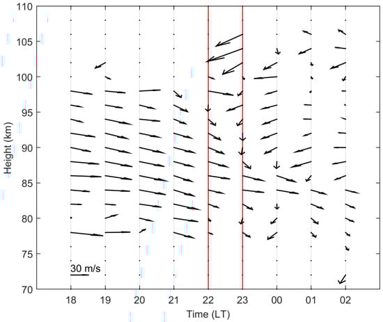 The vector wind profile on the night of 10–11th August 2013. The arrow denotes the direction of the wind; upwards is north, right is east. The CGWs were measured from 22:00 LT to 23:00 LT and are shown as the red lines.