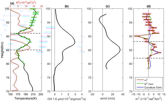 The height profile of (a) temperature and N2 (red line) at 22:16 LT, and (b) the average 1.6 μm OH emission intensity observed by SABER at 22:14 LT, 22:15 LT, 22:16 LT and 22:17 LT on 10th August. The green error bars are the RSS uncertainties. (c) Average height profile of the meteoric wind in the direction of CGW propagation at the Beijing station (39.98° N, 116.37° E) from 21:00 LT to 23:00 LT on 10th August. (d) The profile of the squared vertical wavenumber m2 is calculated by the (a) N2 term and (c) wind; the green (N2 term) and blue (curvature term) lines are the first term and second term in Equation (3). The deviations (red error bars) are propagated by the temperature.
