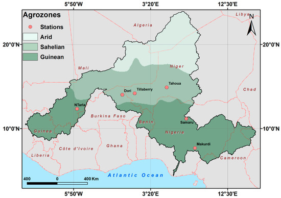 This study is focused on six locations within the Niger River Basin (Figure 1), distributed in three agro-ecological zones, namely; semi-arid (Sahelian) zone (represented by study sites at Dori, Tahoua and Tillabery); the southern Guinea zone (represented by Makurdi) and the northern Guinea zones (represented by Samaru and N’Tarla). Within the semi-arid Sahel, mean annual rainfall declines from 750 mm in the south to 250 mm in the northern limit of the zone, concentrated in a single-peaked rainy season spanning four to five months (i.e., May/June to September/October). The zonal mean annual rainfall is about 500 mm (1981–2010), allowing a growing period of 90 to 120 days. Agricultural production is dominated by cereals and livestock nomadic herding. To the south of the Sahel is the northern Guinea zone, which also experiences a unimodal rainfall season. In this zone, the annual rainfall declines from 1400 mm in the south to 750 mm in its northern limit with zonal mean average of 1050 mm (1981–2011). The rainy season is longer (five to six months), allowing a growing period of 150 to 180 days. Major crop types include maize, sorghum, millet, rice, yams, groundnut, soybean and beans. In the southern Guinea zone, rainfall reaches 1600 mm distributed across seven months, allowing a growing period of 150 to 210 days. Most common types of crops include grains, notably maize and rice, as well as root crops, including yams and cassava.