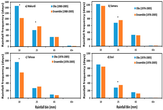 A comparison of the Coordinated Regional Climate Downscaling Experiments (CORDEX) multi-models ensemble and observed frequency of rainfall at different intensities (low, moderate, heavy and extreme) over the (a) Southern (Makurdi) and (b) Northern (Samaru) Guinea agro-ecological zones and (c,d) the Sahelian (Tahoua and Dori) agro-ecological zones for the historical period, 1976/1980–2005. Note, * indicate where the events are significantly different at 0.05 using t-test for mean.