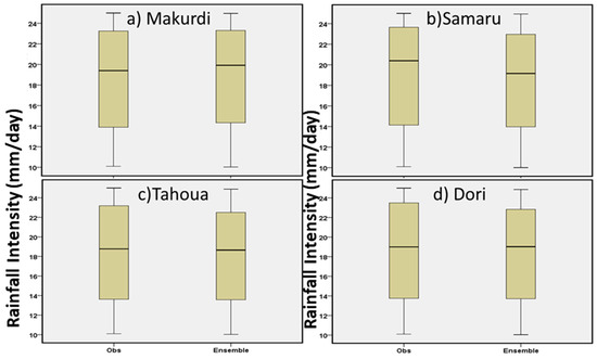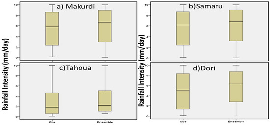 Box and whisker plot comparing the CORDEX multi-models ensemble and observed mean daily moderate rainfall intensity (>10 to ≤25 mm) over the (a) Southern (Makurdi) and (b)Northern (Samaru) Guinea agro-ecological zones and the (c,d) Sahelian (Tahoua and Dori) agro-ecological zones for the historical period, 1976/1980–2005.