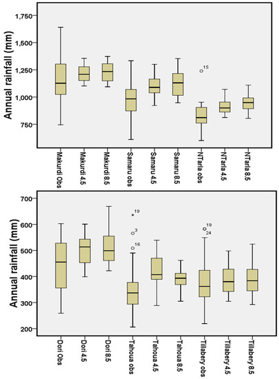 Figure 5 and Table 3 and Table 4 show the summary statistics and mean seasonal precipitation changes for both RCP4.5 and RCP8.5 emission scenarios for the future period relative to baseline. The results show statistically (p < 0.05) significant increases in the future mean annual rainfall for Northern and Sahelian locations for both RCP4.5 and RCP8 but not in the Southern Guinea zone. These results are consistent with other studies (e.g., [26,36,37,39,41], see also scenario 2). However, differences exist even within the same ecological zone. The boxplots show that the observed seasonal rainfall has a much larger range than the projected rainfall, reflecting the well known limitation of climate models to reproduce variability [46,58].