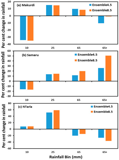 (a) Southern (Makurdi) and (b,c) Northern (Samaru and NTarla) Guinea average ensemble change in the frequency of the rainfall events at different intensities for the future (2021/2025–2050) relative to the baseline (1976/1980–2005).
