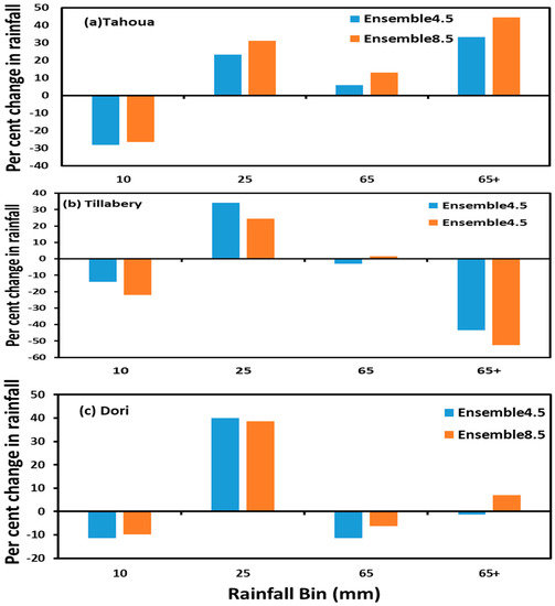 Sahelian ((a) Tahoua, (b) Tillabery, and (c) Dori) average ensemble change in the frequency of rainfall at different intensities of rainfall events for the future (2021/2025–2050) relative to the baseline (1976/1980–2005).