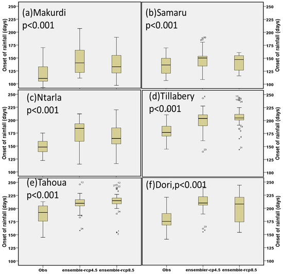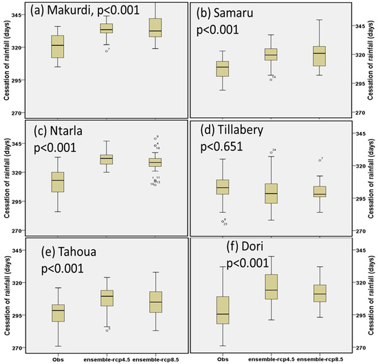 Figure 8, Figure 9 and Figure 10 and Table 4, Table 5 and Table 6 present the summary statistics and results of the mean/earliest/latest dates of onset and cessation of future rains in the Niger River Basin. The results show that on average, the onset of rains will be delayed by between 10 (Tahoua, Dori, Samaru, N’tarla and Makurdi locations) and 32 days at the study locations based on RCP4.5. Similarly, the mean cessation dates of rains will be later by between 10 and 21 days. Despite differences in magnitude, the results are robust and consistent in terms of the direction of change. The overall effect, then, will be a rightward shift of the entire growing season, which will be greater for the start of the rains than for the end. This situation accords with scenario 1 (Table 1). Indeed, as shown in Table 1, this observation is consistent with the findings of several authors (e.g., [16,22,26,27,28,29,30,31,33]) who have reported similar shifts.