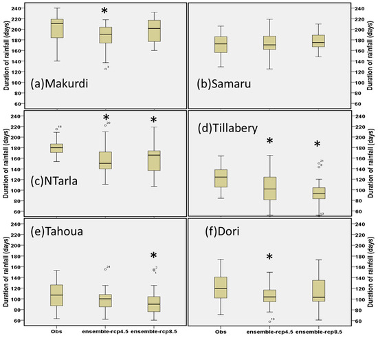 (a) Southern (Makurdi) and (b,c) Northern (Samaru and NTarla) Guinea and (d–f) Sahelian (Tahoua, Tillabery and Dori) average ensemble change in the duration of the growing season for the future period (2021/2025–2050) relative to the baseline (1976/1980–2005). Note, * indicates a significant change (p < 0.05).
