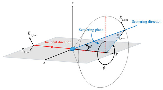 Figure 2 shows the geometric configuration for the scattering of a plane electromagnetic wave propagating along the y-axis by a non-spherical particle. Both the incident and scattered electric vectors can be decomposed into parallel and perpendicular components with respect to the scattering plane, a plane containing the incident and scattering directions. The decomposition is described as follows: