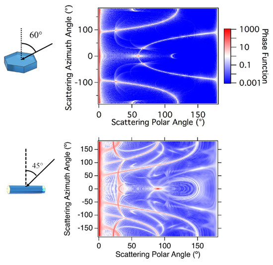 The scattering of light by oriented particles is quite complicated. As an example, Figure 4 shows the two-dimensional phase functions of an ensemble of hexagonal plates (Figure 4, upper panel) and hexagonal columns (Figure 4, lower panel) assuming a horizontally random orientation condition. The plates are randomly oriented in terms of their rotations around the asymmetry axes that are aligned vertically and columns are horizontally oriented with two parallel faces perpendicular to the vertical direction (known as Parry oriented columns). The physical-geometric optical computational program developed by Sun et al. [89] is used for this simulation.