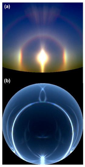 Simulated optical phenomena associated with light scattering by: (a) a mixture of horizontally oriented hexagonal ice plates (7.9%) and randomly oriented counterparts (92.1%;) and (b) the Parry oriented columns. For the simulated sky image, multiple scattering is not included. See also Liou and Yang [4].