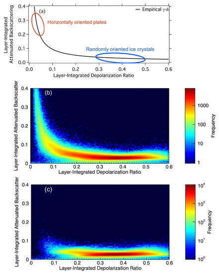 where and are the perpendicular and parallel components of the attenuated backscatter observed at CALIOP 0.532-µm channel, respectively. Hu et al. [99] explained that, in the γ-δ relation shown schematically in Figure 6a, the segment corresponding to strong backscatter and low depolarization ratio is associated with horizontally oriented ice particles, whereas the segment corresponding to weak backscatter and large depolarization ratio is associated with 3-D randomly oriented ice particles. In following Hu et al. [99] to investigate the aforementioned theoretical speculation, Figure 6b shows the CALIOP data for the γ-δ relation as observed during April 2007. At that time, the CALIOP lidar was in a nadir-viewing configuration and the specular reflection by horizontally oriented ice particles was so substantial that the lidar pointing configuration was soon adjusted to point away from nadir. Figure 6c is similar to Figure 6b except the data were obtained during April 2009 when CALIOP lidar pointed 3º off the nadir. In the case of Figure 6c, the specular reflection is not observed by the lidar receiver and the segment of large γ and small δ is missing in Figure 6c. The comparison of panels 6b and c of Figure 6 unequivocally confirms the existence of oriented ice particles.
