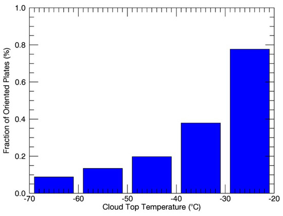 With observations made by CALIOP and the Infrared Imaging Radiometer (IIR), both of which are on the CALIPSO platform, Saito et al. [100] derived the percentage of oriented ice particles. The results are shown in Figure 7. The fraction of oriented ice particles is less than 1% at cloud temperatures warmer than −30 °C but further decreases with temperature. These results are essentially consistent with those by Zhou et al. [101] and Chepfer et al. [102]. Based on the current evidence, it is quite reasonable to assume ice particles to be randomly oriented for passive remote sensing applications that do not involve polarimetric measurements. Note that polarimetric microwave measurements are sensitive to hydrometeor orientations [26], and the assumption may introduce errors in ice cloud retrievals based on the measurements. With the assumption of the random orientation condition for the scattering particles, the single-scattering properties and the equation of radiative transfer are significantly simplified. Specifically, the phase matrix depends only on the scattering polar angle and is independent of the azimuthal angle of the scattering plane. The phase matrix is in a diagonal-block form as in Equation (10) (note: the diagonal-block form implies that the particles have an equal number of mirror-imaging orientations in addition to the random orientation condition). Furthermore, a scalar extinction coefficient can be used instead of the extinction matrix for radiative transfer simulations.