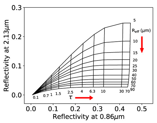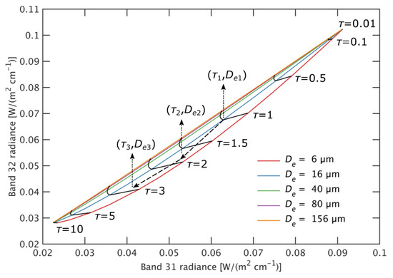A complementary approach for inferring the optical properties when the optical thickness is lower than the optimal range for a reflectance-based method in the VIS-SWIR bands is to use split-window measurements in infrared channels at 11 µm and 12 µm (e.g., [105]). These measurements are provided by most weather satellite imagers. Figure 9 shows the look-up table constructed by split-window measurements from MODIS bands 31 and 32 (11 µm and 12 µm, respectively).