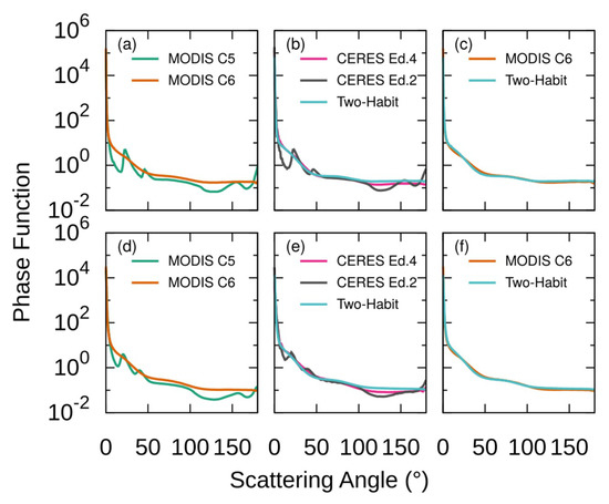 Comparison of the phase functions at wavelength 0.86 µm based on: (a) MODIS Collection 4, 5, and 6; (b) CERES Edition 2 and 4, and the two-habit model; and (c) MODIS Collection 6 and the two-habit model. (d–f) Counterparts of (a–c) at wavelength 2.13 µm. Effective radius is fixed at 30 µm.