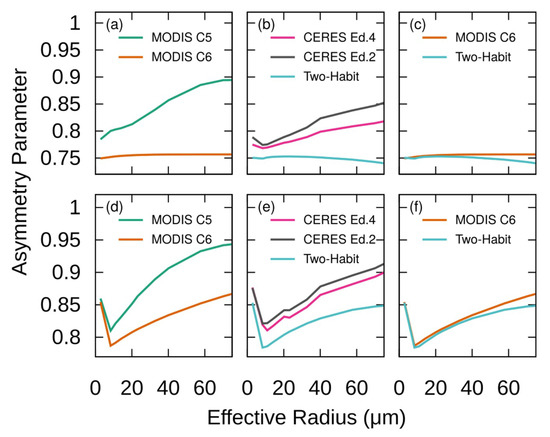 Comparison of the asymmetry parameter at wavelength 0.86 µm based on: (a) MODIS Collection 4, 5, and 6; (b) CERES Edition 2 and 4, and the two-habit model; and (c) MODIS Collection 6 and the two-habit model. (d–f) Counterpart of (a–c) at wavelength 2.13 µm.