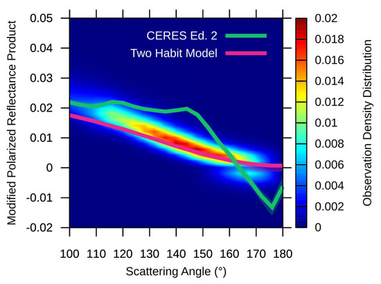 Figure 15 shows the probability density distribution of the modified polarized reflectance from the POLDER observations and the counterparts from the simulations assuming the two-habit model and the CERES Edition 2 model. Overall, the observed modified polarized reflectance decreases with increasing the scattering angle over a range of 100–170°. The simulations based on the two-habit model closely match with those from the observations except at the scattering angles with 100–120° because of the weak polarized side scattering by the Two-habit model, whereas the simulations based on the CERES Edition 2 substantially deviate from the observations. Therefore, the two-habit model is much more appropriate than the CERES Edition 2 model in terms of the consistency between the model-based modified polarized reflectance and the measured counterparts at the scattering angles within 100–170°.