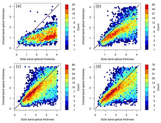 - Heidinger, A.K.; Li, Y.; Baum, B.A.; Holz, R.E.; Yang, P. Retrieval of cirrus cloud optical depth under day and night conditions from MODIS Collection 6 cloud property data. Remote Sens. 2015, 7, 7257–7271. [Google Scholar] [CrossRef]