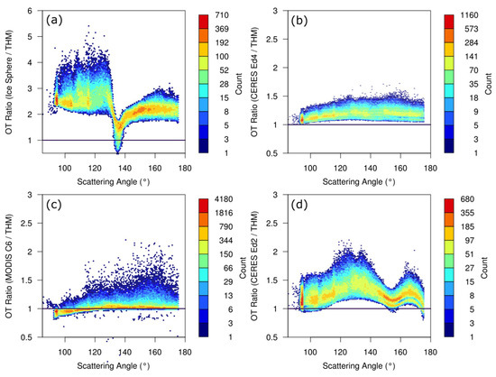 With the CERES Edition 2 model and the two-habit model as an example for comparison, it is straightforward to speculate that the optical thickness values retrieved with the two-habit model are smaller than their counterparts based on the CERES Edition 2 model. This is because from Equation (31) and , as evident in the upper middle panel of Figure 13.