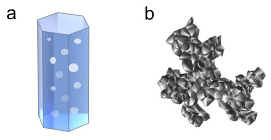 Ice particles in the atmosphere are exclusively non-spherical particles (e.g., [63,64,90,91]). Beyond the spherical approximation for non-spherical ice particles, one of the earliest non-spherical models considered horizontally oriented cylinders [92], as illustrated in Figure 3. Specifically, ice particles are assumed to be long circular cylinders that are oriented horizontally in relation to their rotational axes. In Figure 3a, the cylinder axes point along the same direction, whereas, in Figure 3b, the cylinders are horizontally oriented in a random manner. While analytical light-scattering analysis for an infinitely long circular cylinder [93,94] is applied to approximate the single-scattering properties of a finite circular cylinder through an appropriate scaling procedure, Liou’s ice cloud models shown in Figure 3 were used by others (e.g., [95,96]) who showed that the significant differences in the single-scattering properties of spheres and cylinders resulted in pronounced difference in radiance simulations.