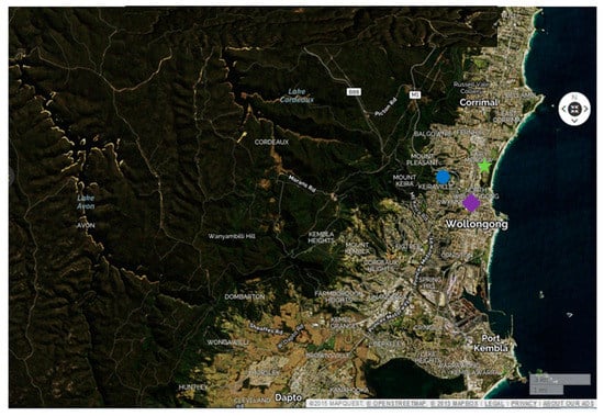 Satellite view of the region showing the main Measurements of Urban, Marine and Biogenic Air (MUMBA) site (green star), Wollongong Office of Environment and Heritage (OEH) Air Quality station (purple diamond) and the University of Wollongong (blue circle). Also visible is the large industrial area at Port Kembla and the extensive forested regions to the West. The image was created using the website: www.mapquest.com “© OpenStreetMap contributors”.