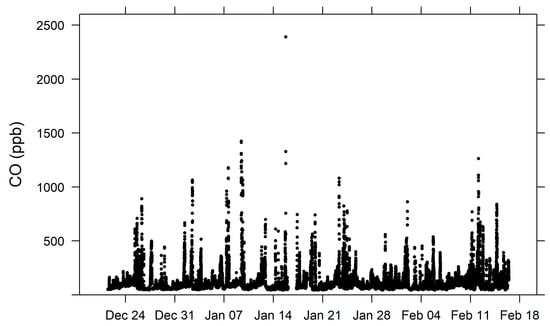 The CO time series measured at the main MUMBA site is shown in Figure 2 (each measurement takes three minutes). It is characterised by numerous enhancement events during which the CO far exceeds usual “background” values (seen by the thick undulating baseline of the plot). Enhancements above 500 ppb from clean Southern Hemisphere background levels around 50 ppb are not uncommon. However, a number of these events occur overnight and may therefore be the result of a build-up of local emissions within the nocturnal boundary layer. Note that the peak three minute values of approximately 2400 ppb (and peak hourly average values of 860 ppb) are well below the Australian National Environment Protection Measures (NEPM) ambient air quality standard for CO of 9000 ppb for 8 h []. Another feature is the significant variability of the underlying background values, ranging from ~50 ppb to ~100 ppb, suggesting large differences between regional-scale air-masses sampled during the campaign.