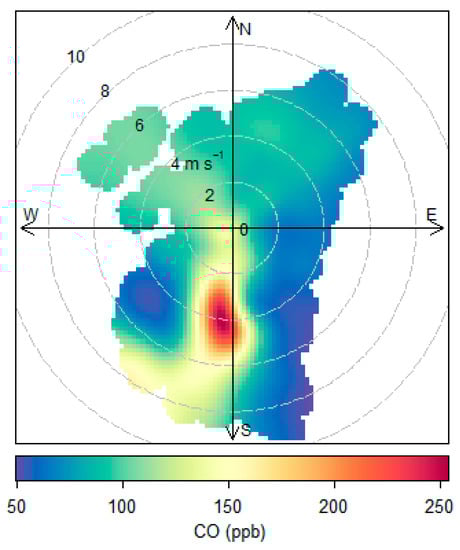 The potential impact of different air-masses sampled on Wollongong inhabitants can be better illustrated using a bivariate polar plot [], which shows how a pollutant varies by wind speed and wind direction. Figure 3 is a bivariate polar plot for CO measured at the main MUMBA site throughout the campaign. Several distinct regions are evident, the most obvious being very high CO measured during southerly winds between 2 and 6 m·s−1. Winds from this direction bring to the site air-masses that have passed over central Wollongong and the industrial area encompassing the Port Kembla steelworks south of the city centre. In contrast, the figure shows that easterly to south-south-easterly winds typically bring very low amounts of CO to the MUMBA site as the air-masses come from the Pacific Ocean.