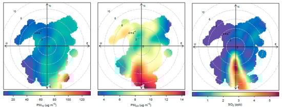 PM10, PM2.5 and SO2 polar bivariate plots of hourly average measurements from the OEH air quality station at Wollongong during the MUMBA campaign.