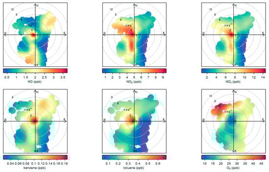 The benzene and toluene polar bivariate plots (shown in the bottom left and centre of Figure 5 respectively), both show strong enhancements at low wind speeds, indicating local sources causing build-up within the nocturnal boundary layer. In contrast, low concentrations are associated with marine air from the south-east, and toluene concentrations decrease as the wind speed increases in all other directions, again indicating local traffic as the dominant source. Benzene shows stronger enhancements than toluene from the south (as it is emitted from the Port Kembla steel works) and also from the north-east, in the direction of outflow from the Sydney basin, consistent with aged pollution and the longer atmospheric lifetimes of benzene compared to toluene [].