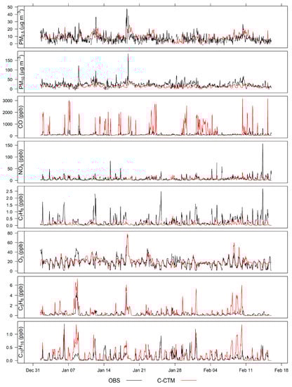 Time-series of measured and modelled PM10 are shown in the second panel of Figure 6, and the correlation coefficient is 0.37 with 58% of modelled data with a factor of two of the observations (Table 3). Despite C-CTM again capturing most of the fluctuations in baseline amounts of PM10, there are several large peaks in the observations that are missed in the model, including peaks on the two extreme temperature days of the 8 and 18 January 2013. Statistically, C-CTM’s performance shows a better correlation coefficient for PM10. As Emery et al. [] do not recommend updated benchmarks for PM10, the model skill for PM10 is evaluated using the benchmarks defined by Boylan and Russell, []. C-CTM meets both their model performance goals for particulate matter with a mean fractional bias smaller than ± 30% (−27.5%) and a mean fractional error smaller than 50% (37.8%).