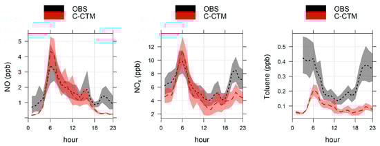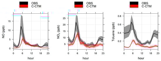 Average daily variations of mean mole fractions of NO, NOx and toluene during the campaign. Observations are shown in black and simulations using C-CTM are shown in red, with the dark central line representing the mean and the shaded area the 95% confidence interval.
