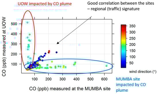 CO measured at the University of Wollongong (UOW) site plotted against coincident CO measured at the main MUMBA site. The plot is coloured by wind direction measured at the MUMBA site.