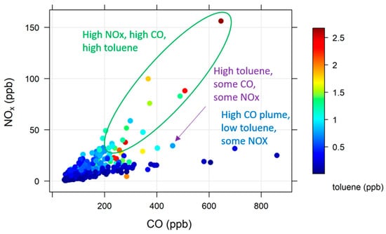 NOx plotted against CO measured at the main MUMBA site. Data points are coloured by toluene concentrations.