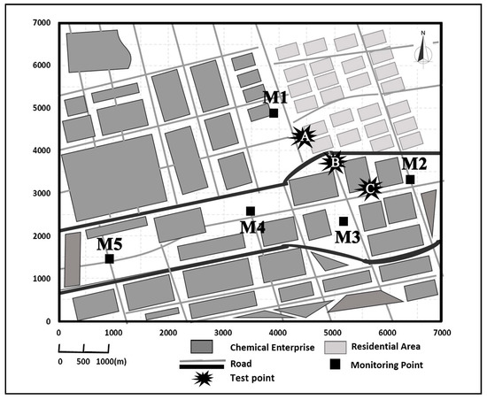 The studied case is a chemical industrial park about 22.5 km2 (Figure 1), in which there are lots of chemical industries specialized in petrochemicals, paints, inks, pigments, synthetic materials, medicines, pesticides, and several sewage treatments, etc. There are over 70 odor sources in this study region and there are few sources out of the study region. The source density in the northern part of this park was about 2–6 companies per square kilometer, while its southern counterpart was about 0.5–1.5 companies per square kilometer. Source heights range from 15 to 85 m. There are five fixed ambient air quality monitoring stations (M1–M5) and their surrounding conditions were described in Table 1. Hourly measurements of wind and methyl mercaptan concentration, as well as SO2 concentration observations, in 2014, were collected in this study.