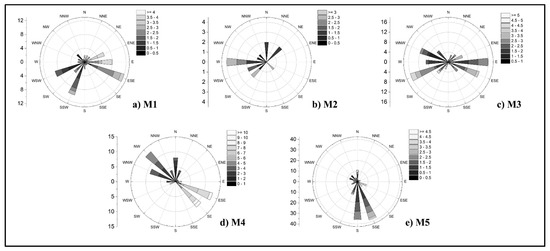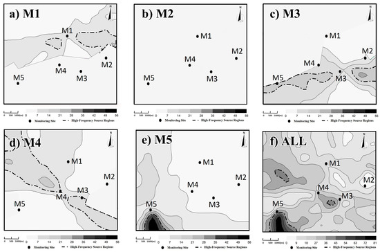 Figure 11a presents two regions around M1 with more than 14 frequencies traced by back-calculation of pollution episodes. The frequency of these two regions accounted for 53.70% of the total frequency of independent episodes at M1 from Figure 2 and Figure 7b. Similarly, the areas located in two high-frequency wind directions of M3 in Figure 11c have more frequencies to be traced, making up a 55.21% share of the total frequencies of the independent episodes at M3. Figure 11d illustrates that the northwest and southeast regions of M4 belong to high-frequency source areas. In the pictures above, it is clear that the high-frequency region around M2 is not obvious, due to having the fewest violation records and its unstable wind. M5 had the most violation records, and its pollution wind directions were concentrated in the southeast and south directions, as shown in Figure 2. Therefore, the obtained source areas were concentrated on their upwind regions, and the cumulative frequency in these wind directions accounted for 59.38% of the total frequencies of M5. As displayed in Figure 11e, the frequency around M5 is gradually reduced from the intermediate maximum value to both sides. Two reasons can explain the regular frequency distribution: one is the overlay of obtained diverse resolutions under different atmospheric stabilities with the same dominant wind direction; the other is the overlay with the adjacent wind directions. Concentration observations at M5 would be easily elevated under both of the two wind directions.