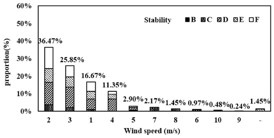 Besides, the differences in wind speed and other wind direction characteristics could not be ignored. More than 80% of meteorological conditions were with wind speed of 1–4 m/s and with the atmospheric stability of D–F in this study, as shown in Figure 3. The real-time wind speed difference between the contaminated station and other stations was between 0.001 m/s and 6.414 m/s, and the real-time wind direction difference was in the range of 0°–178.457° at the same time. As can be seen in Table 2, the highest wind speed difference appeared between M1 and M4, with a maximum of 2.421 m/s. The wind speed values at M1 were generally lower than values at other stations. By contrast, the wind speed values at M4 were higher than those at other stations. The largest wind direction difference occurred in M3 and M5, with a maximum of 40.364°.