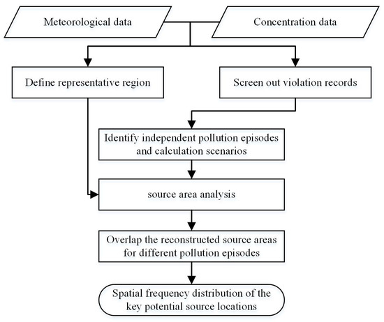 We outlined the process of statistical source area analysis method to obtain the spatial frequency distribution of the key potential source locations (summarized in Figure 4). There were two important pre-processing steps: screening out violation records and defining the representative regions for each station, starting from the long-term meteorological and concentration measurements, which were then input into the procedure, and independent pollution episodes, as well as calculation scenarios, were identified. Next, source area analysis method was employed to back-calculate source area results for each independent pollution episode. Finally, the frequencies of grid cells as potential source locations were summarized to obtain the spatial frequency distributions of the key potential source locations for each station and the study region. The detailed procedure was organized as follows.