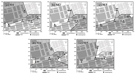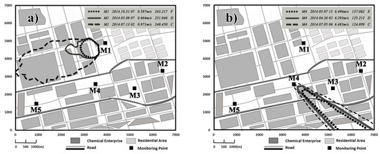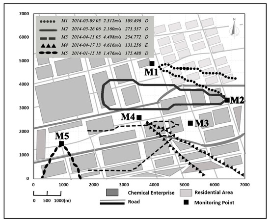 The presented results in Figure 8 happened at various times at M1–M5. Most pollution episodes at M1 occurred with wind direction of ESE, SSW, and WSW (Figure 2), including a small area in the northeast of the industrial park. The case of M1 happened at 05:00 on 9 May 2014, with a wind direction of 109.5°. Meanwhile, the wind direction of M2 and M3, which are located in the upwind region of M1, were 79.0° and 198.8°, respectively. As a result, their wind directions were inconsistent with those of M1. The calculation domain range of M1 was limited to the M2 and M3 cutoffs, avoiding the misjudgment of source locations.