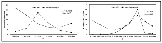 The pollution episodes that resulted from adverse meteorological conditions were excluded first. This was done as per the concentration change of SO2 and methyl mercaptan. SO2 emission sources were mainly fossil fuel combustion sources, which were irrelevant to emission sources of methyl mercaptan. Bad weather would be considered as the cause of the elevated methyl mercaptan concentrations if their concentration variations were in good consistency. Time series analysis by means of the statistical Pearson correlation was employed to evaluate their consistency in the concentration variations [26]. The time period before and after the pollution incident was selected, and it was needed to ensure that the pollution event happened in the middle of the selected time period as much as possible. Examples on consistency judgment were shown in Figure 6.