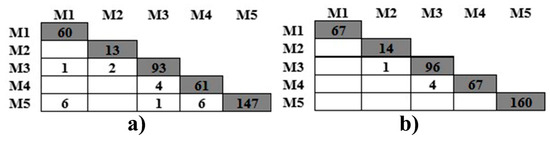 A total of 414 violation records were indexed by the alarm system in 2014. Some of them appeared simultaneously. Figure 7a presented the frequencies of violation records at different sites. The diagonal values in the lower triangular matrix displayed the frequencies of violation records at a single site, and the others were the frequencies of simultaneous violation records at two sites. It could be seen from Figure 7a that 414 violation records, only, shared 394 h. Forty violations occurred simultaneously at two sites and covered 20 h. Only one violation record appeared at M1 and M3 simultaneously, and the same with the frequency at M3 and M5; six violation records simultaneously appeared at M1 and M5, which was the same as at M4 and M5; the violation records at M2 shared four hours with those at M3.