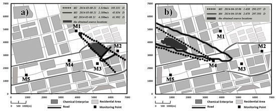 Source area results at M1 from the pollution episode at 21:00 on 8 May 2014 are shown in Figure 10a. Concentration measurements at M1 had been over the alarm limit for twenty hours, while concentrations of other sites were below the limit. During the period, the dominant wind direction of M1 was 105.331° (SSE). Meanwhile, those of M2 and M3 were 62° (east-northeast, ENE) and 45° (northeast, NE), respectively. Theoretically, both M2 and M3 could be used for source identification as assistant monitoring sites. In fact, only M3 could be used as an assistant monitoring site because if M2 recorded a pollution episode, the determined source locations were no overlap with those of M1. In such a strategy, the determined source area of M1, in this case, was found in the distance of 2.4–3.2 km above its upwind direction, as shown in Figure 10a.