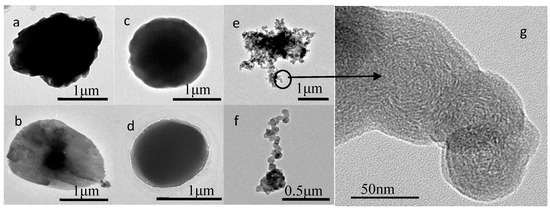 TEM images of primary individual particles: (a,b) mineral particles, (c) spherical organic particle, (d) near-spherical organic particle, (e) aged soot particle and (f) chain-like soot particle; (g) amplified soot spherical.