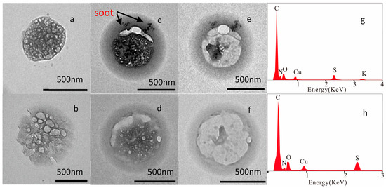 HS particles are foam-like as shown in Figure 2a,b. Although they are not strictly evenly distributed, we term these particles as homogeneous mixed S-rich particles (HS). Although HS particles look similar in the TEM images, they may display different optical and/or hygroscopic properties because of their mass fractions of sulfate, OM, and/or nitrate [22]. Apart from HS particles, we also find some secondary particles with organic coating. These core-shell particles clearly show an uneven surface, as shown in Figure 2c,d. When exposed to electron beam irradiation, the core disappeared, leaving some residues and an obvious shell structure as shown in Figure 2e,f. The organic shell and inorganic core have been certified by using a nanometer-scale secondary ion mass spectrometer (Nano-SIMS) according to Li et al. [25].