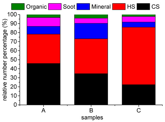 A total of 810 individual aerosol particles (336 for A, 246 for B and 228 for C) were analyzed in this study. Figure 3 shows the relative number percentage of individual aerosol particles. The results showed that there was a large proportion of secondary particles because of the strict emission control measures. During the 2015 China Victory Day parade control periods, HS particles and CS particles represent the major fraction with 44.9% and 34.3%, respectively, followed by mineral particles (10.5%), soot aggregates (7.21%) and organic particles (3.2%; Figure 3). Soot aggregates and organic particles show relative lower number percentage. It is consistent with Wang et al. [26], who reported that both the primary organic carbon and elemental carbon had the relative lower proportion during the control period.