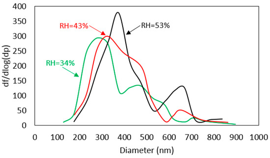 Size distributions of secondary particles at RH 34%, 43% and 53%.